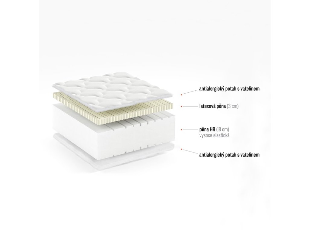 1. Latexová pěna je komfortní, trvanlivá, flexibilní a tvarově stálá i po mnoha letech používání. Má velmi vysokou elasticitu, není toxická, neohrožuje životní prostředí a po stlačení se velmi rychle vrací do původního stavu. Odborníci ji doporučují pro její výborné ortopedické vlastnosti. Latex je odolný proti plísním i bakteriím a je velice vzdušný (pěna má otevřenou strukturu buněk), díky čemuž snadno odvětrává vlhkost.